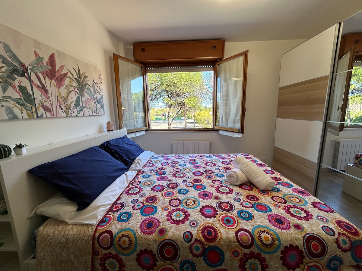 Velkommen til Par71, vores hyggelige toetagers lejlighed på anden sal i et byhus med en fantastisk udsigt over Marco Simone Golf Club. Den ligger kun 17 km fra Roms centrum og en kort køretur fra Tivoli Villa. Der er et fuldt udstyret køkken, spiseplads, stue med sovesofa og 55" tv og balkon. Ovenpå finder du to soveværelser, et skrivebord til arbejde eller studier og en anden balkon. Par71 er perfekt til både korte og lange ophold og er komfortabelt vært for op til seks personer. CIN:IT058047C2V7QLXHWB