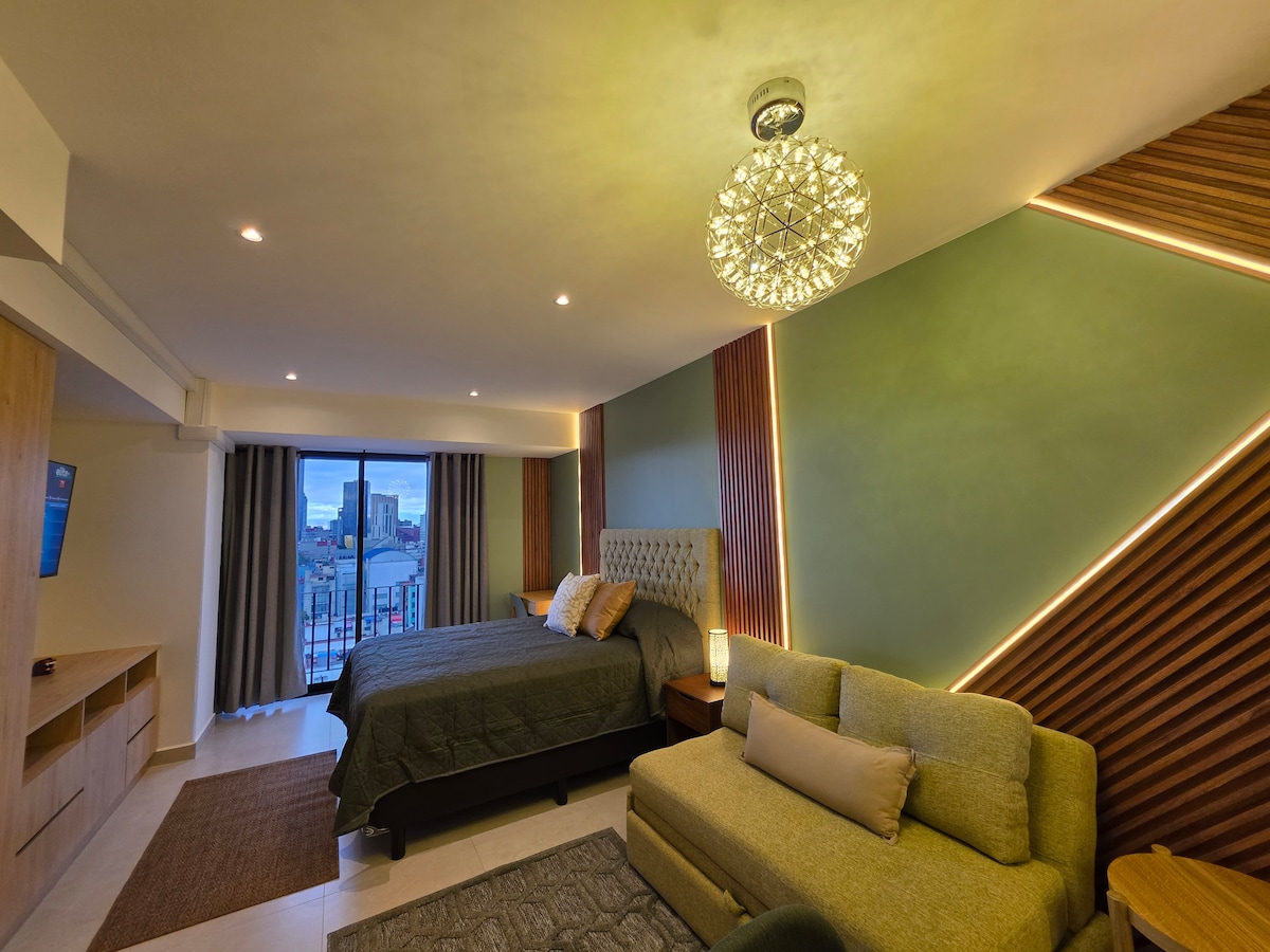 Nyt loft i en moderne bygning foran Alameda Central, ideel til to personer. Har et 50" tv, elevator, køkken med mikrobølgeovn, privat badeværelse og wi-fi. Kun 10 minutter fra det historiske centrum og tæt på ikoniske steder som Bellas Artes, Torre Latinoamericana og museer. Perfekt til et komfortabelt, centralt og stilfuldt ophold i Mexico City.