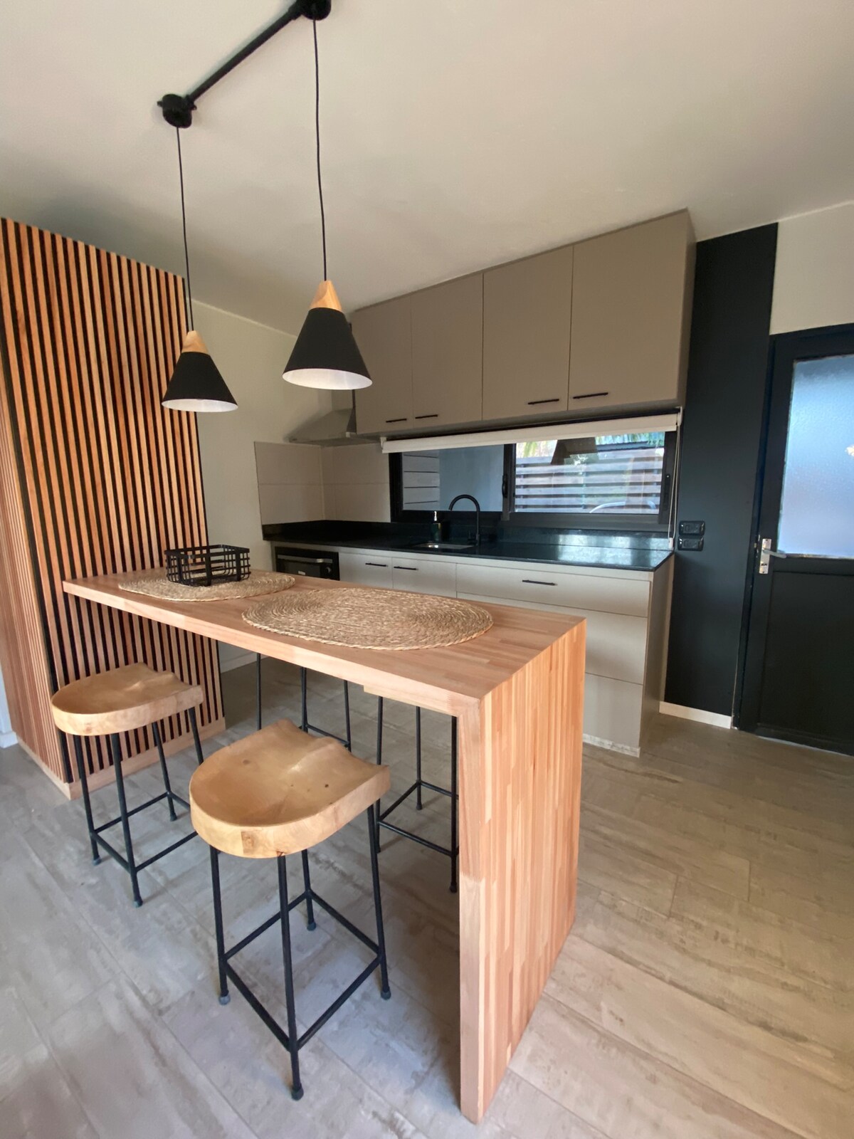Las habitaciones no son continuas. En la amplia sala de estar hay dos cómodas camas individuales.al lado hay un salón luego la cocina después encuentras una de las habitaciones dobles . Bajando una pequeña escalera a otro nivel está otra habitación doble .