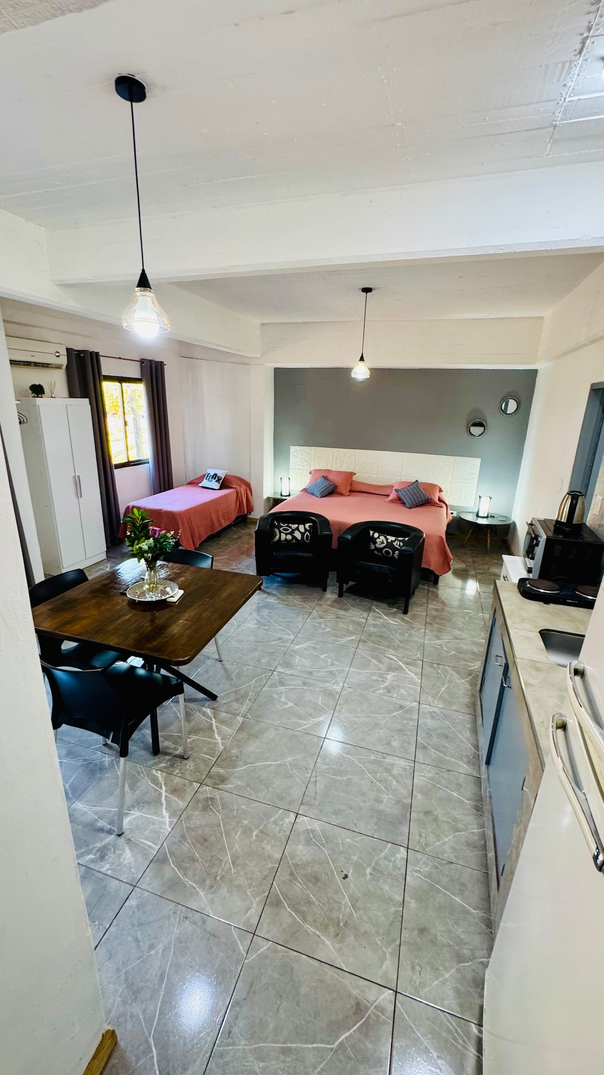 Nyd et behageligt og praktisk ophold i denne fuldt udstyrede lejlighed. Den har 1 soveværelse med dobbeltseng, en sofa i marine-stil med en kommode nedenunder med en madras. Fuldt køkken, tv, aircondition, sengetøj og håndklæder. Ideel til op til fire personer. Perfekt til korte ophold, på vej til en anden destination eller for dem, der har brug for at være i nærheden af Samic Hospital i skift eller ledsage et familiemedlem.