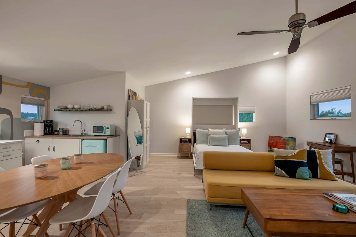 Unikke luksuriøse gæstehuse med et soveværelse ved Pedernales River i Johnson City. Perfekt til en mindeværdig udflugt til Texas Hill Country og vinruten. Smuk udsigt og adgang til floden. Hvert hus er ~650 kvadratfod, med kingsize-seng, moderne badeværelse, en stue/fuldt udstyret køkken og en udendørs terrasse. Luftmadrasser kan leveres til op til to mere, eller to par kan leje begge huse. Trapper fører dig ned til floden. Ingen kæledyr. Gratis niveau 2 EV-oplader (Tesla og J1772). Intet rengøringsgebyr.