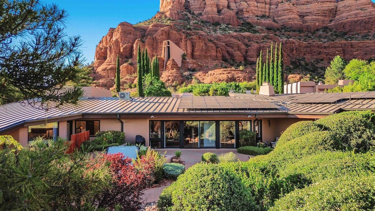 Enjoy majestic views of famous Sedona Red Rocks in the luxury of your own private villa. Steps away from iconic Chapel of the Holy Cross, popular hiking trails. House features mid-century modern aesthetic, 1- KING size , 1 -Sofa bed with 2 baths, 2 spacious living rooms, kitchen, office, outdoor dining space w BBQ. After a day in the desert, just short distance away, head to Downtown Sedona, pursue incredible art galleries and explore local restaurants ! TPT# 21426328/ 1,800 Sq. Ft.