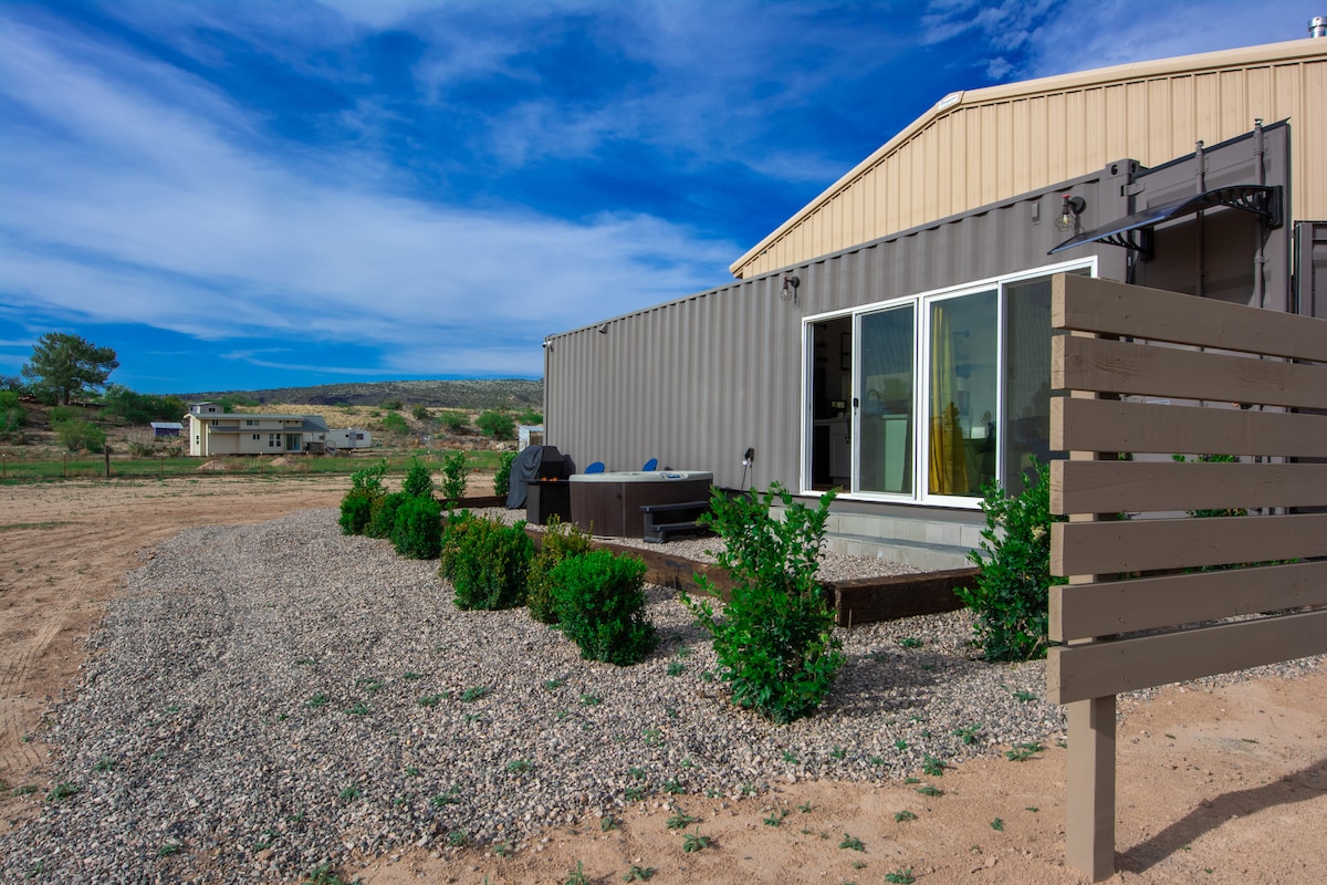 Escape to this modern shipping container retreat in the serene landscape of Cornville, Arizona, just minutes from Sedona. Perfect for couples or single travelers, this unique getaway blends sleek design with natural beauty. Soak in the private hot tub, unwind in the stargazing lounge chairs, or cook a cozy meal in the fully equipped kitchenette while taking in peaceful mountain views. Please see our guidebook for recommendations! We are a small family run business! Shop Small, Stay Local💛