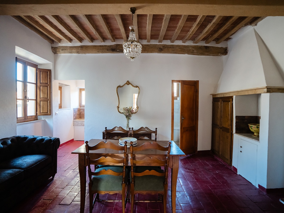 Huset har en sjælden og fortryllende udsigt over Val d'Orcia og Monte Amiata, hvilket sikrer maksimal privatliv. Interiøret afspejler den toscanske stils charme med antikke møbler og finish lavet af lokale håndværkere. Det er udstyret med et dobbelt soveværelse, en stor stue med et stort bord, et fuldt udstyret tekøkken, en dobbelt sovesofa foran pejsen i stuen. Udenfor giver terrassen dig mulighed for at spise med solnedgangens farver som baggrund.