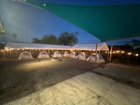Velkommen til den ultimative Rave Oasis! Fordyb dig i hjertet af SoCal Raves i vores hippe Airbnb. Kun en gåtur væk fra hovedindgangen til The Nos Center. Ingen linjer, ingen trafik. Vi har dig dækket med et telt til tre personer. Nyd vores 3 helt nye toiletter og brusere SAMT et fælles køkken på stedet! Tilpas din bolig! Medbring dine måtter, luftmadrasser, tæpper og puder med, så du kan få den ultimative komfortoplevelse. Tilpas din plads, og skab en hyggelig oase midt i den fantastiske spænding.