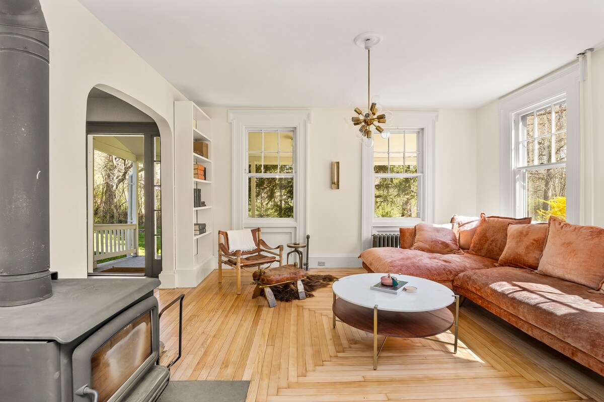 1873 Stilfuld og hyggelig Hudson Farmhouse med en brændeovn og den perfekte veranda. 14 minutters kørsel til Warren St Denne bolig med 3 soveværelser + kontor er blevet kærligt opdateret, samtidig med at de oprindelige detaljer i denne historiske ejendom er bevaret. Beliggende på over en hektar jord, på en stille gade, er dette fredelige fristed den perfekte flugt til at slappe af og slappe af. Med højt til loftet, tonsvis af overdimensionerede vinduer og et åbent layout føles dette hus både luftigt og lyst.