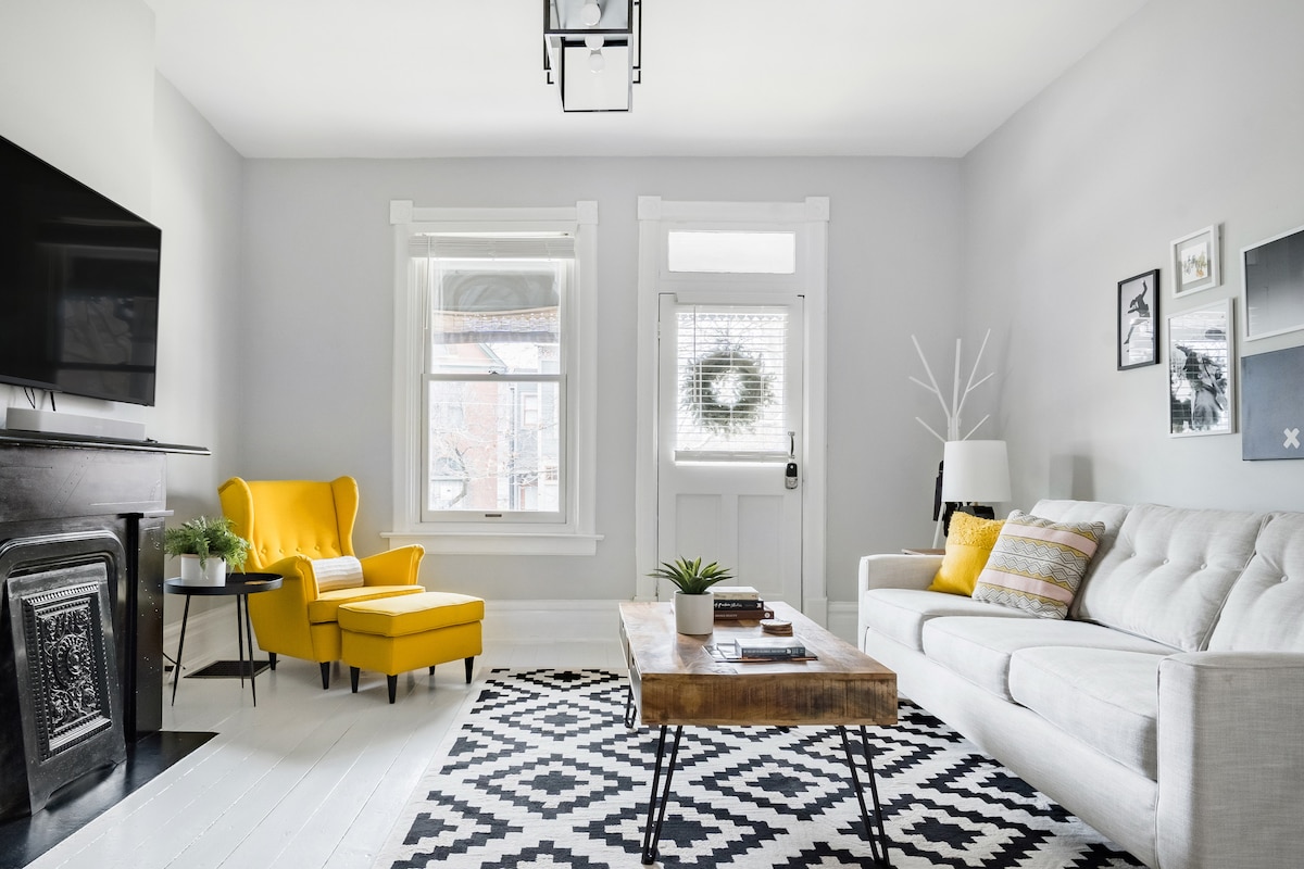 Du vil ELSKE nem adgang til alt fra denne centralt beliggende historiske tyske landsbyhus. En designers blanding af historisk og stemningsfuld moderne. Fuldt udstyret køkken, stor stue med enestående vægenhed, stort tv, stort soveværelse og 1 1/2 badeværelser, gratis vaskeri på stedet og privat udendørsområde og bålplads. Gå overalt i German Village; 5 min kørsel til centrum, OSU, Nationwide Children's Hospital; mindre end 10 min til Expo og Convention Center. Vores bedste restauranter ligger få blokke væk!