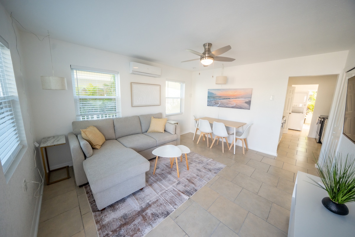 1 of 3 units in private beachside villa tucked away on a quiet street. Walk to many restaurants. Everything new. **Washer/dryer in unit. **Private patio. **Full sized kitchen. **Quiet ductless AC, **Free parking in front. **BEACH supplies provided. Total serenity at this best kept secret stretch of beach, steps from your door. Wide beautiful beach goes for miles. 1 bedroom super comfy queen bed, separate living room very comfortable pop-up sofa. 2 more units available; 1 bdm & 2 bdm.