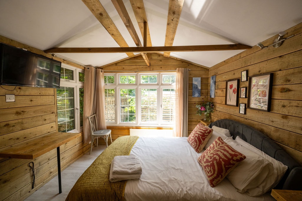 Hyggelig bjælkehytte med kingsize-seng og tilhørende badeværelse. Boligen har sin egen private hoveddør og ligger i en landsby med fantastiske gåture og cykelruter. Der er parkering i køreturen, og om sommeren er der udendørs siddepladser. Landsbyperle af en pub, The Crown & Green ligger 100 meter fra ejendommen, og det er en kort køretur til Ludshott Common, Waggoners Wells og The Devils Punchbowl. 1,5 miles eller 4 minutters kørsel fra bryllupsstedet Cain Manor. Nem adgang til A3.