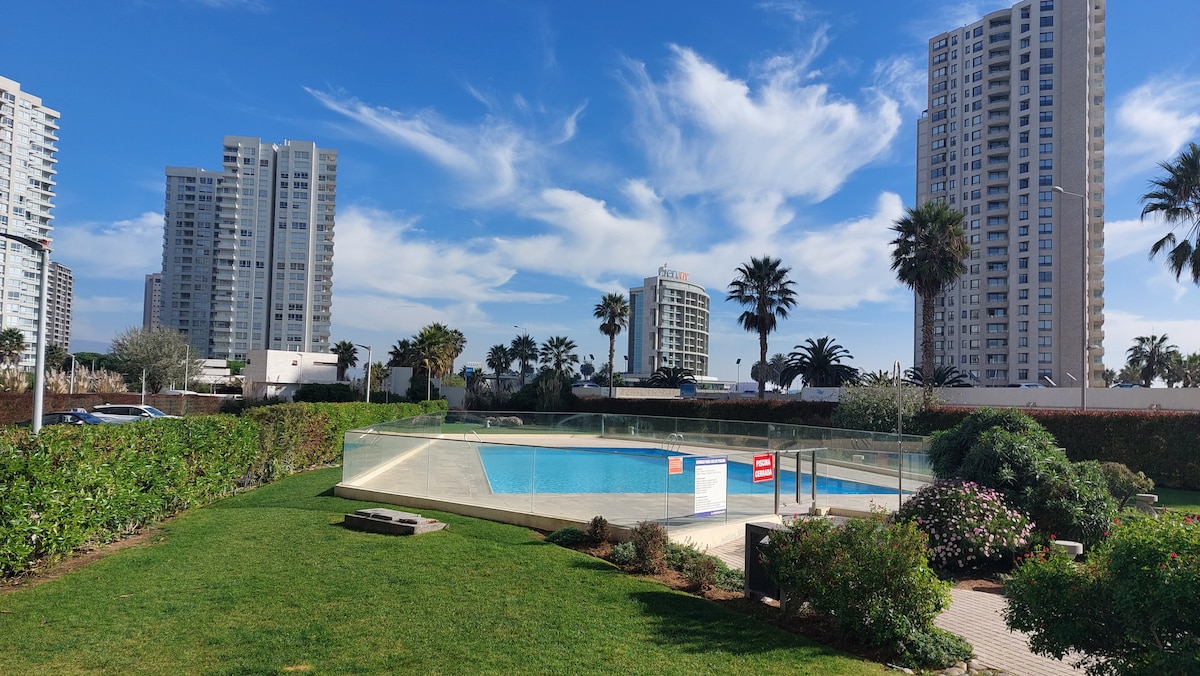 Nyd en fantastisk beliggenhed én gade fra stranden og få skridt fra Enjoy Casino. Tæt på restauranter, caféer og barer ved kysten af La Serena. Lejligheden er omgivet af grønne områder og har swimmingpool, grillplads, parkering, elevator og døgnåben portner. Lejligheden er fuldt udstyret og har to soveværelser, det ene med en dobbeltseng og det andet egnet som arbejdsplads med et skrivebord. Sengetøj og håndklæder er inkluderet. Smart-tv og WiFi.