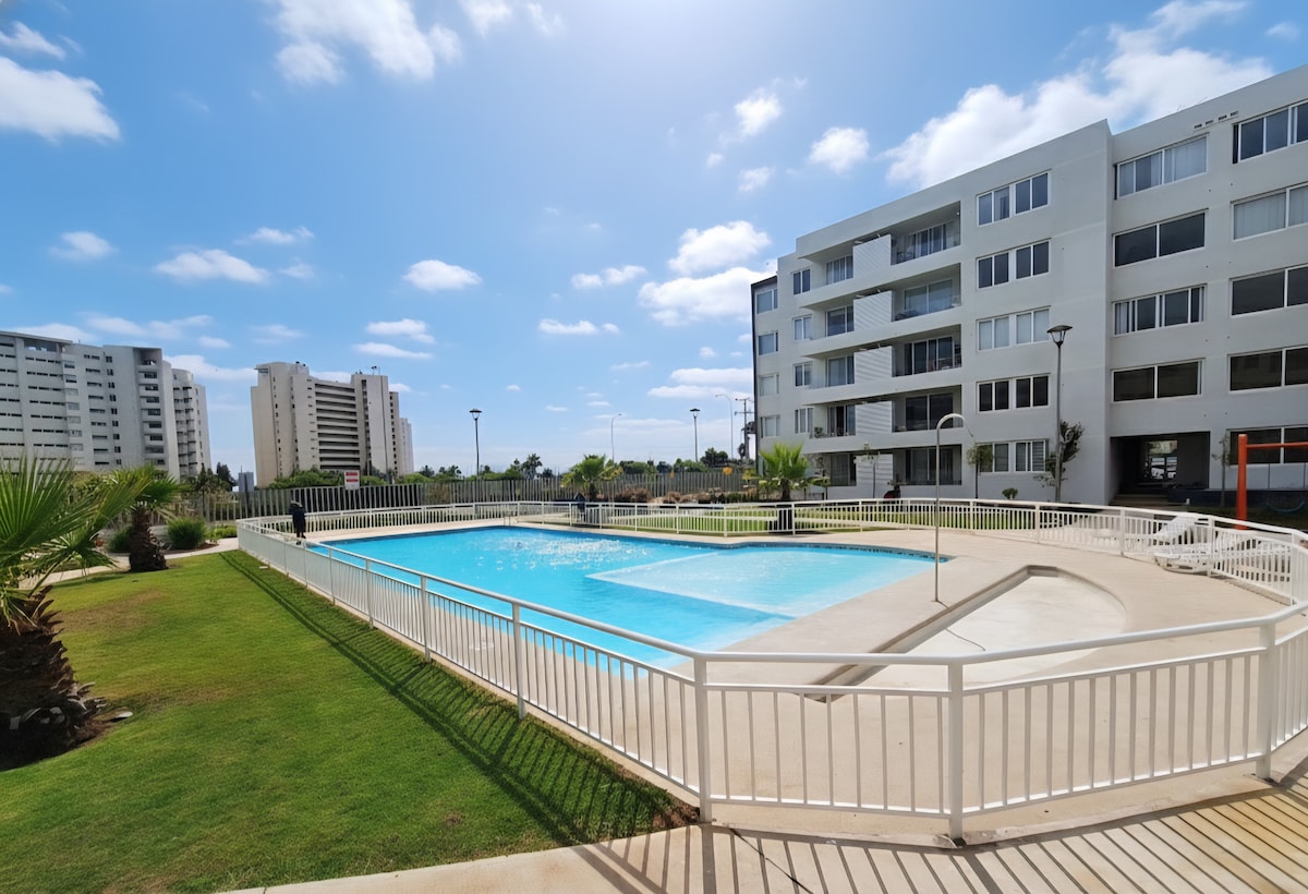Flygt til Coquimbo! Hyggelig lejlighed til 5 personer foran stranden med 2 soveværelser (dobbeltseng, hytte og sovesofa), fuldt udstyret køkken, Wi-Fi, vaskemaskine/tørretumbler, overvågning døgnet rundt, privat parkering og elevator (13. etage). Beliggende kun to blokke fra Mall Vivo, Centro, supermarkeder, busterminal, bugt, ved siden af den lokale messe og aktiviteter såsom piratbådture. Ideel til at slappe af, nyde havet og udforske området. Book dit ophold, og lev oplevelsen!