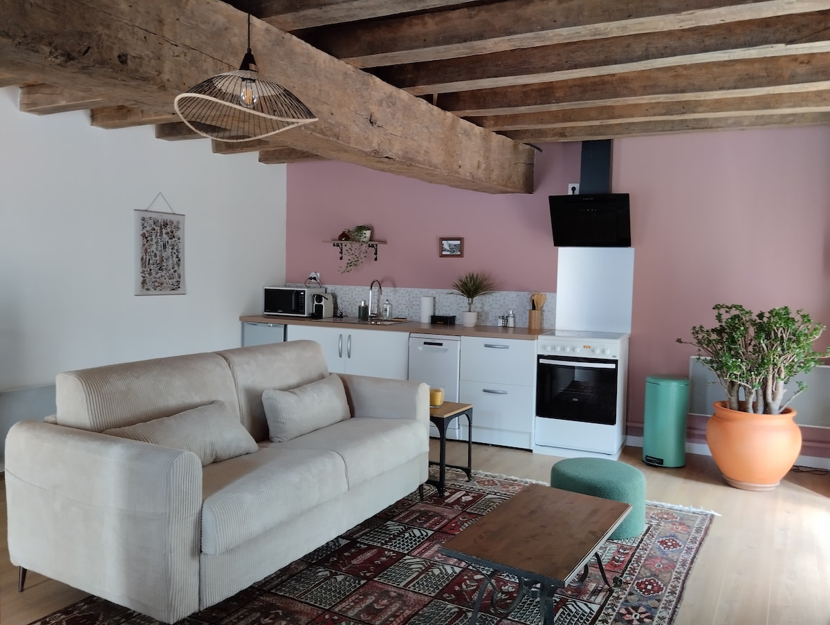 Restaureret gîte i en gammel lade på 120 m2 beliggende i hjertet af Loire-slottets område i centrum af landsbyen Cellettes (butikker i nærheden: bageri, supermarked, kiosk, restaurant osv.). Du kan udforske området på cykel, takket være stierne "châteaux à vélo".