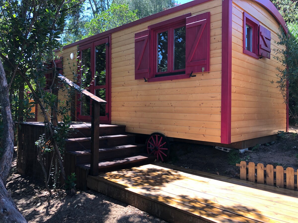 Oplev vores usædvanlige hytte, en autentisk pioner-vogn beliggende i hjertet af maquis under korkegetræer. Fordyb dig i en unik oplevelse, der kombinerer gammeldags charme og moderne komfort. Fuldt udstyret: Køkkenkrog (køleskab, kogeplader, mikrobølgeovn, grill), bruser, toilet, el. Denne atypiske bolig er ideel til en forfriskende udflugt, hvor du kan koble af og nyde roen. For at fuldende dit ophold, er en fælles swimmingpool til rådighed på området.