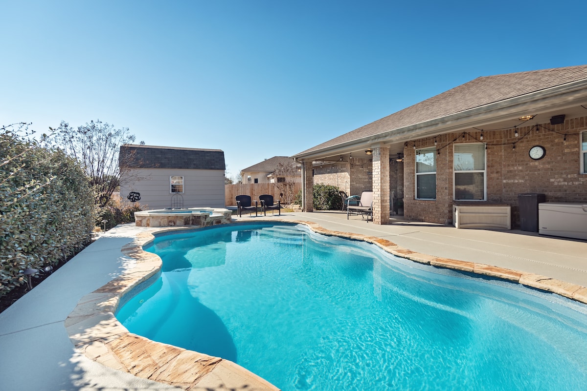 Stunning 4-bedroom lakefront retreat with 180° views of Belton Lake. Sunsets from nearly every room! This beautifully remodeled home features a second floor master suite with a private balcony, spacious kitchen, large deck, private pool, hot tub and dreamy outdoor dining. Peaceful, private, and perfect for making lasting memories. Please note that the pool is not heated. Thanks to the Texas climate, the water temperature is typically very comfortable from April through October.