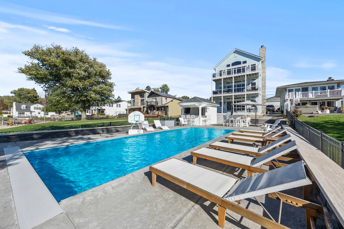 Lakefront 6BR med opvarmet pool, bålplads og bådplads
