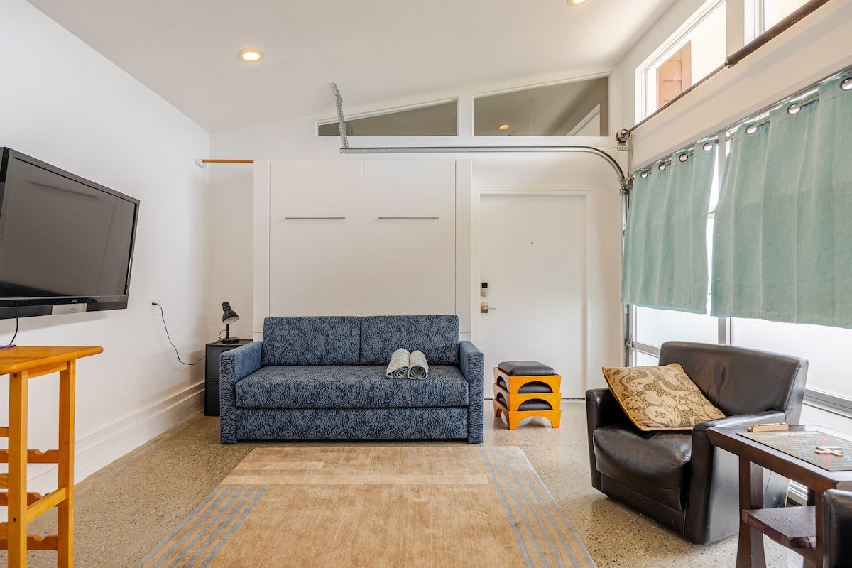 For a quiet nighttime stay and light-filled Studio in Costa Mesa with a lovely, large European backyard behind our family home. The bright, sunny & airy one-room Studio with roll-up window wall has half curtains and is furnished with a queen-size Murphy bed, dining table, chairs, kitchenette, and TV. Enjoy the temperate weather of Coastal Orange County and relax in a patio area with its chairs and table. Murphy bed setup - look for the link