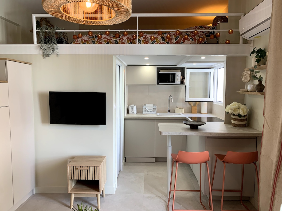 Nyd en unik beliggenhed i denne 48 m² store, airconditionerede duplex, der ligger på 3. sal (ingen elevator) i hjertet af den gamle by. Lejligheden har panoramaudsigt over havet fra den private terrasse, der er knyttet til soveværelset, så du vågner op til udsigten over Middelhavet. Den tilbyder et fuldt udstyret køkken, en hyggelig stue med synlige bjælker og elegant møblering. Kun få skridt fra stranden og det charmerende historiske centrum. Masser af butikker i nærheden. Ideel til en romantisk ferie!