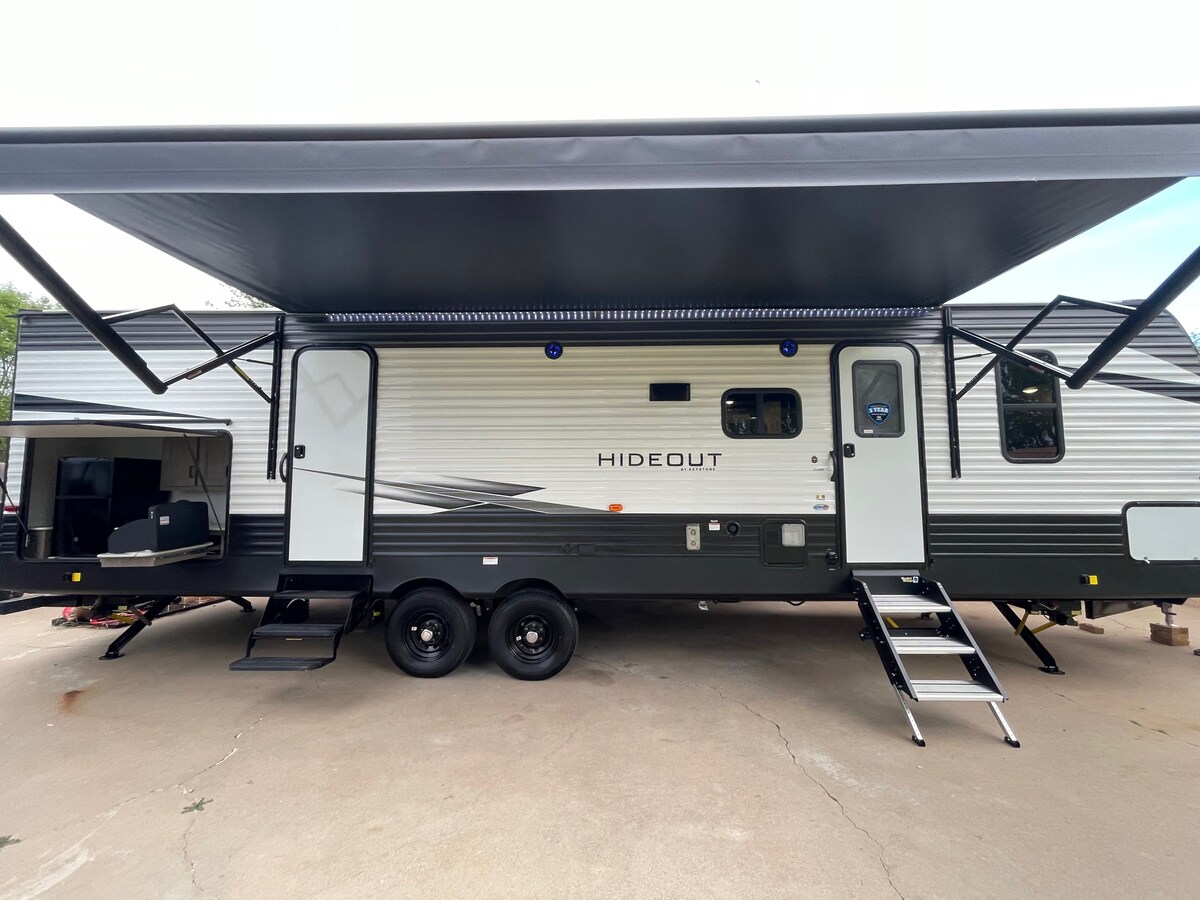 Bemærk, at denne campingvogn opbevares i min bolig og vil blive sat op i indkørslen. You can make a reservation for a campground at your cost, there will be extra fee for delivery and set up. Rejsetrailer 2021 med plads til ti personer! Udendørs køkken, køjeseng har 4 senge med plads til op til 6 personer. Komfur, køleskab i fuld størrelse, bord og sofa redder begge til senge. Pejs, tv, stereoanlæg med indvendige og udvendige højttalere. Soveværelset har queensize-dobbelts Omfatter udendørs tæpper, bålgroprist til madlavning og meget mere!
