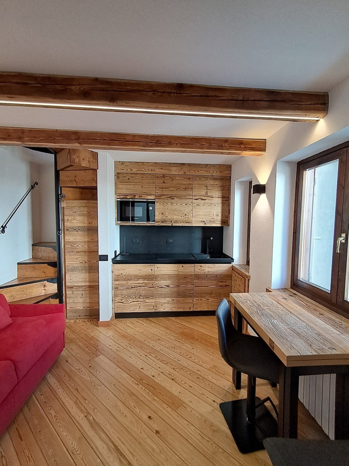 Beliggende 10 minutters gang fra centrum af Courmayeur og en kort afstand fra skibakkerne, i en meget stille gade, kombinerer lejligheden, helt renoveret, traditionelle elementer, såsom den store sten pejs og den mørke trægulv, med møbler moderne med henblik på design. Det er udstyret med alle bekvemmeligheder, herunder tv, wi-fi og bil garage. Et enestående udgangspunkt for at udforske Upper Valle d'Aosta blandt slotte, bjergvandreture og skiløb.
