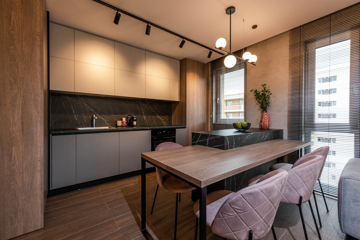 A uniquely and carefully designed, this apartment perfectly combines coziness with stunning Scandinavian accents. Situated in a new residential neighborhood, we go above and beyond to ensure a unique experience for our guests. Our home can accommodate up to 4 people and has its parking lot. The standout feature of this penthouse is the spacious terrace with a jacuzzi and a panoramic view over the mountains, being ideal for couples, business travelers, solo adventurers, or families (with kids).