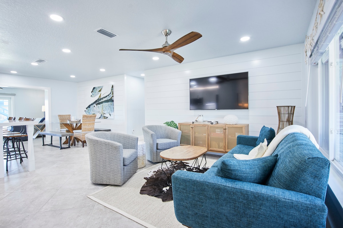 JUBII!! DET ER TID TIL SJOV I SOLEN!! Velkommen til denne opdaterede, dejlige bolig i et charmerende, roligt "Old Florida" -kvarter! Den lyse stue har et 50" smart-tv, morgenmadsbar med taburetter og et spisebord. Køkkenet er EKSTRA fyldt op! KING SUITE har et badeværelse, og der er et Coral Queen Room og et Groovy Bedroom med en queensize-seng og en udtræksseng, som deler et badeværelse i gangen. OSR ligger lidt over 1,6 km fra centrum, bådramper og alt, hvad King's Bay har at byde på.