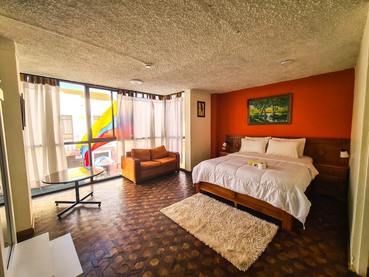 Superior Double Room for 1 to 2 people with a double bed and private bathroom at Pepe's House Cuenca Hotel & Boutique Hostel in Cuenca's Historic Center. Blackout curtains. Buffet breakfast included + free coffee/tea/cookies all day. Free parking from 6 p.m.-8 a.m., TV with children's and family channels. Quiet policy from 11 p.m. to 6 a.m. for a better night's sleep. 13 minutes from the airport. Bilingual receptionists from 7 a.m. to 9 p.m., and free luggage storage (for check-in and check-out)