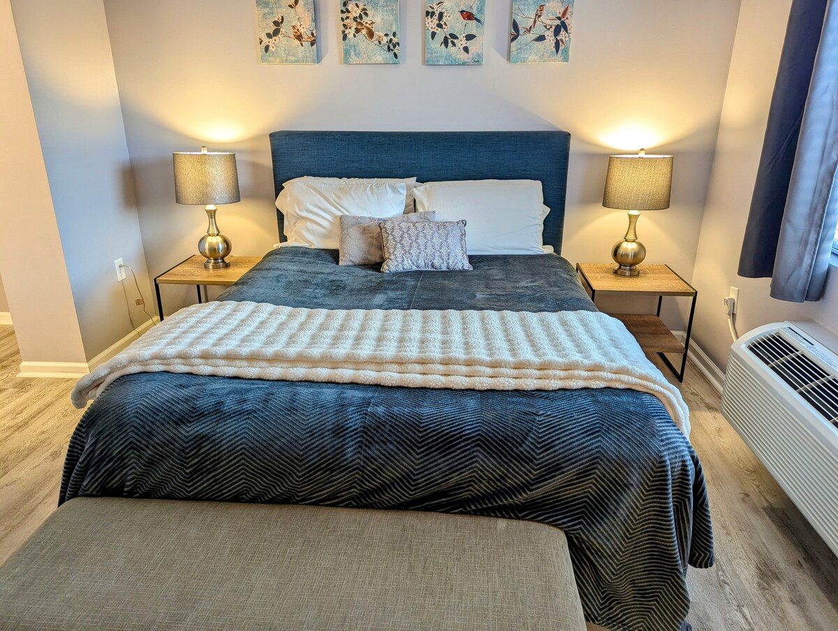 Cook in a full kitchen and dine at a farm table especially for the space. The feeling is modern chic, simplicity meets the style of brass faucets, modern lighting, and beautiful floors. Well lit, the space is very homey, with a queen sleeper sofa, one King Bedroom and One Queen bedroom with extra comfortable beds. The open layout makes the loft feel very spacious. Location is everything and we are 5 min from downtown, but tucked in a quiet neighborhood! Short Term Rental Permit #--2016071615
