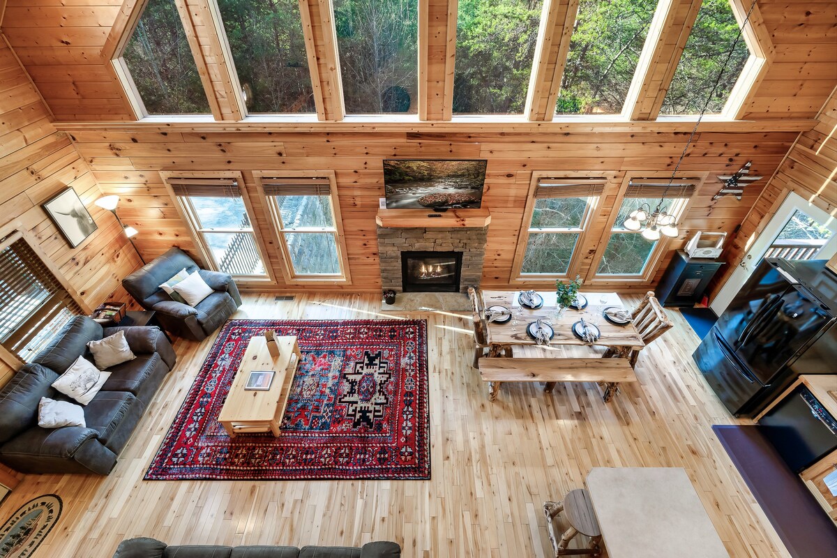 Vågn op til fantastisk udsigt over Smoky Mountain fra alle etager i denne luksuriøse hytte med 3 soveværelser. Nyd et privat spabad, udendørs bålplads, indendørs pejs og smart-tv. Se film i biografen i kabinen, spil spil i spilrummet, eller grill aftensmaden, mens du spiller en runde cornhole. Det fuldt udstyrede køkken, herunder en sjov vaffel- og kornbar, gør det nemt at lave mad og spise der. Få minutter fra stier, underholdning og spisning – men alligevel perfekt gemt væk for fred, komfort og uforglemmelig udsigt.