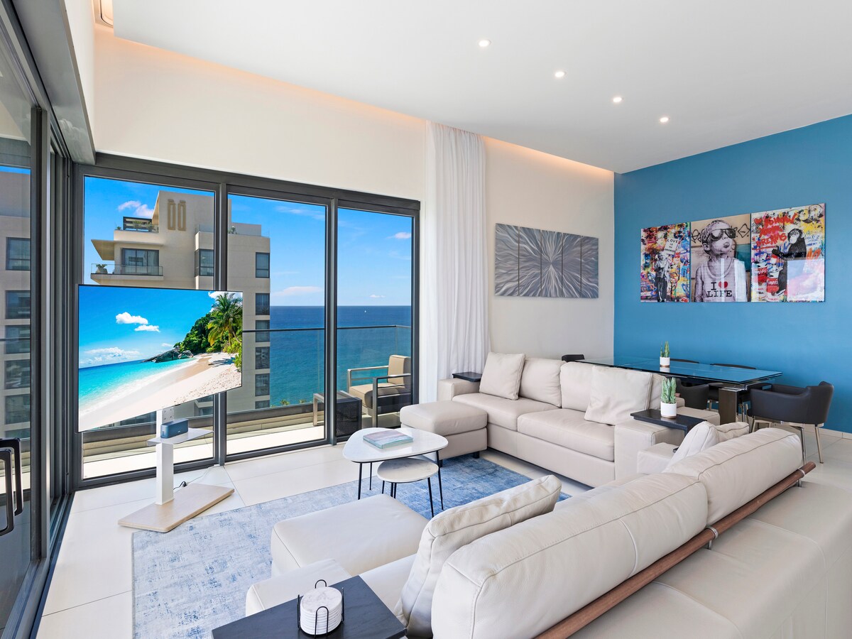 Blue 614 ligger på 6. sal i Blue Mall i Cupecoy og er en lys, moderne feriebolig med 2 soveværelser, åben planløsning og en privat terrasse, der vender mod solnedgangen. Ankom nemt via elevator og nøglefobindgang til den bemandede reception; garage og parkering på stedet til rådighed. Minutter til Mullet Bay og Cupecoy strande, Maho spisning og den franske grænse. Ideel til par, venner eller forretningsrejsende, der søger udsigt, komfort og bekvemmelighed.