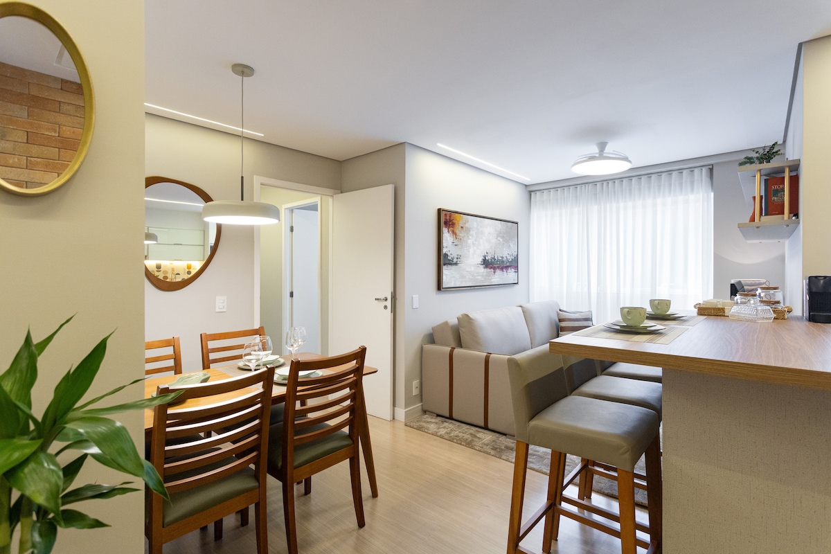 Nyd komfort og funktionalitet i denne upåklagelige studiolejlighed på 35 m2. Beliggende i hjertet af Ecoville. Ideel til et par, små familier eller ledere. Sengetøj og håndklæder i soveværelset. Internet WI-FI 600 mb, NETFLIX. Ampla balada med grill, smuk udsigt over naturen. Der er 02 tv's smarte 43" og 32". Privilegeret beliggenhed: Shopping Barigui, parker, restauranter, bagerier, apoteker, kaffe, PUB'er, markeder. Kun 5 km fra centrum af Curitiba. Personlig service før og under opholdet.