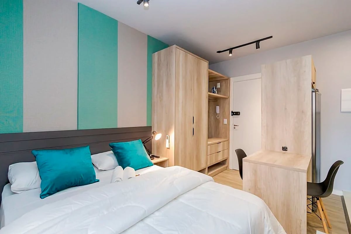 Oplev charmen ved vores atelier i Curitiba, der er ideelt til op til to gæster. Med en queensize-dobbeltseng og et komplet køkken. En fremragende central beliggenhed, du vil være blot et par skridt fra byens vigtigste seværdigheder. Stedet tilbyder døgnåben concierge, fitness, vaskeri og et fælles arbejdsmiljø. **PARKERING ER IKKE INKLUDERET I DEN DAGLIGE PRIS** I lejligheden kan du finde: - Seng og badeværelse er inkluderet – Wi-fi og 55" smart-tv - Varmt/koldt aircondition - Udstyret køkken