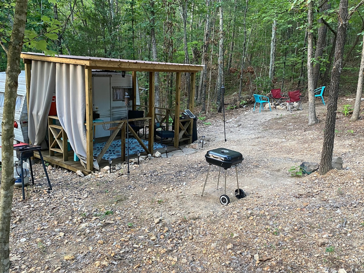 1968 Vintage Camper, der er klar og venter på alle, der ønsker at komme ud og udforske og nyde naturen. Har aircondition, seng i fuld størrelse, minikøleskab, kaffekande, grillkulgrill, lejr Det er lille, men åh så hyggeligt. Der er kun en kort gåtur til et udendørs brusebad med varmt vand, sæbe, shampoo og balsam, men du bedes medbringe dine egne håndklæder i nærheden af kompostbadeværelset.
