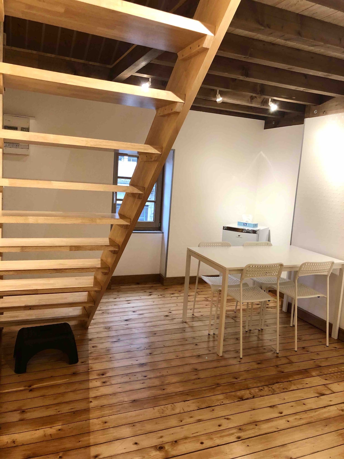 APPART de 27m2 au 1er étage, composé de : 1 palier vestiaire, 1 pièce à vivre avec cuisine ouverte entièrement équipée ( lave-linge, cuisinière induction avec hotte, micro-onde, cafetière, bouilloire, grille pain, frigo ) avec coin TV, 1 chambre lit double, literie neuve. 1 salle de bain avec vasque, douche, sèche serviette et WC indépendant . L’ appartement a été entièrement refait à neuf, au calme dans une rue à sens unique, avec stationnement gratuit.
