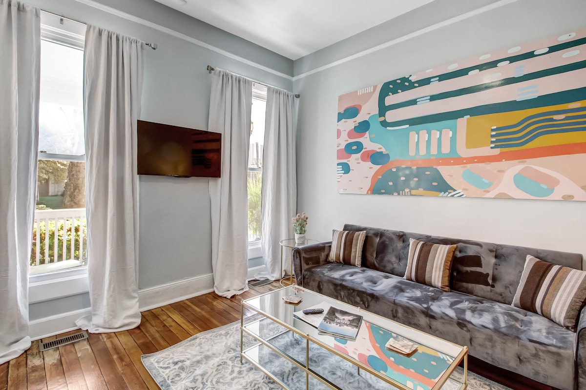 Charmerende lejlighed med 1 soveværelse i et smukt nabolag, der er nemt at komme rundt i til fods, lige syd for Forsyth Park, og fuld af eklektiske butikker, madglade restauranter og fede barer. Gratis cykler til at hjælpe dig med at udforske, og den gratis DOT-shuttlebus stopper i nærheden. Vi ligger på Thomas Square/Starland, tæt på Forsyth Park (0,5 mil) og det historiske distrikt (ca. 1 mil). Praktisk beliggenhed for eventyr til Tybee Beach. Efter en travl dag kan du vende tilbage til dit hjem væk hjemmefra for at slappe af i en fredelig have væk fra det hele.