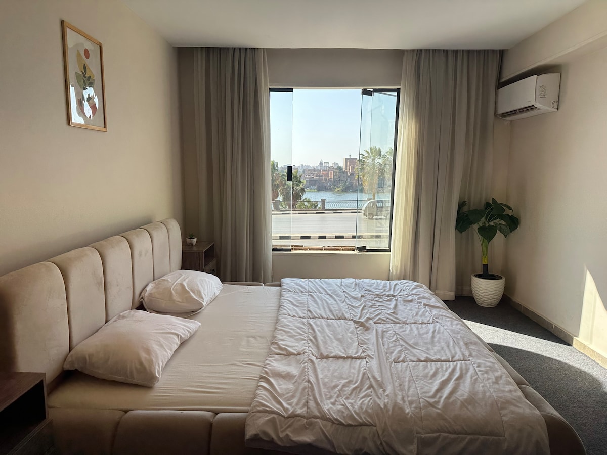 Velkommen til din sindsro Fantastisk udsigt over Nilen Vågn op til panoramaudsigt over Nilen, hvor solopgangen maler himlen i levende nuancer. Nyd din morgenkaffe på balkonen, mens du ser bådene glide forbi *Rummelige og stilfulde interiører* Vores lejlighed er designet med din komfort i tankerne. Bedste beliggenhed #Faciliteter til ethvert behov fuldt udstyret køkken eller nyde en filmaften med vores smart-tv, vi har alt, hvad du behøver for et behageligt ophold. Vi glæder os til at byde dig velkommen!