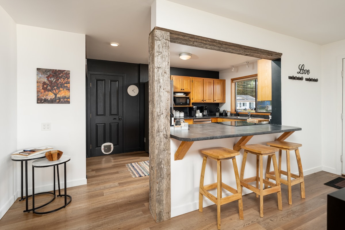 Fantastisk lysfyldt skovhjem med uberørte flodstier kun få skridt væk. Arkitektdesignet med professionelt køkken, førsteklasses senge og vinduer fra gulv til loft, der indrammer tårnhøje træer. Nyd din egen store private indhegnede gårdhave med bålplads og udendørs spisning. Fredfyldt og rolig, men 15 minutter til Courtenay og Cumberland, 25 til Mt. Washington. Perfekt til familier og hunde. "Dette er ikke bare en Airbnb-bolig, det er en perfekt kurateret oplevelse." – Nina ★★★★★ "Et virkelig magisk og unikt sted" – Caitlin ★★★★★