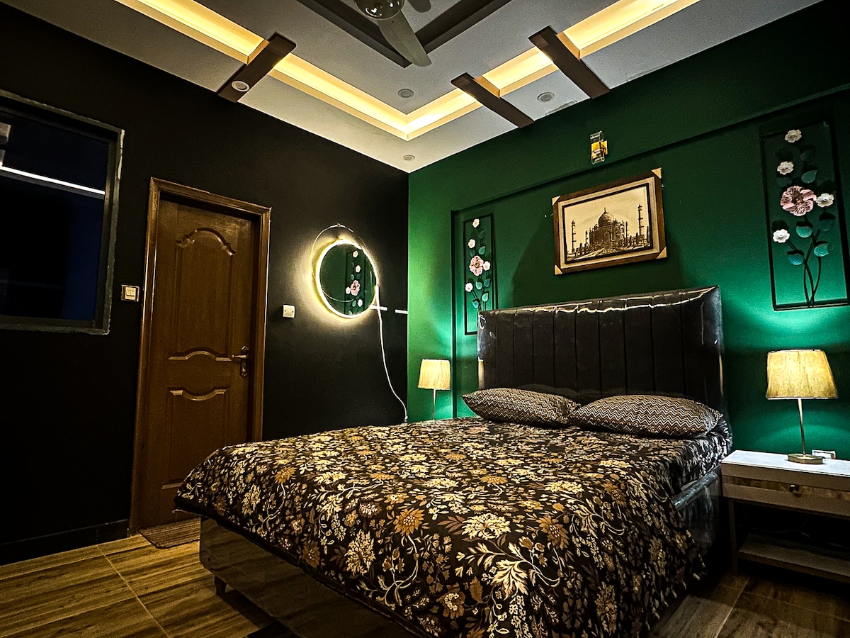 This entire studio apartment having a bedroom, a living room, and kitchen cum dining area located at DHA Phase VI Small Bukhari on 1st floor has everything you need. Sink into comfy queen bed, vibe out to tunes on the JBL sound system, or chill in the living room on velvet sofa. With two bathrooms, there's no waiting around. Cook up a storm in the sleek kitchen, then enjoy it under the glow of the arc lamp by a stunning master painting. Plus, enjoy a welcome basket, water and cold drinks on us.