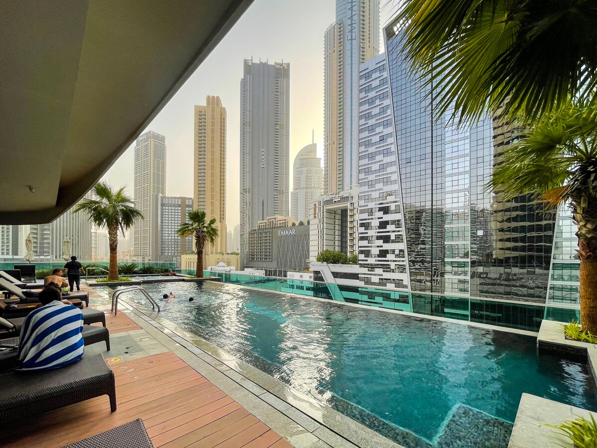 Berømt infinitypool med udsigt over Burj | Rummelig 1BR
