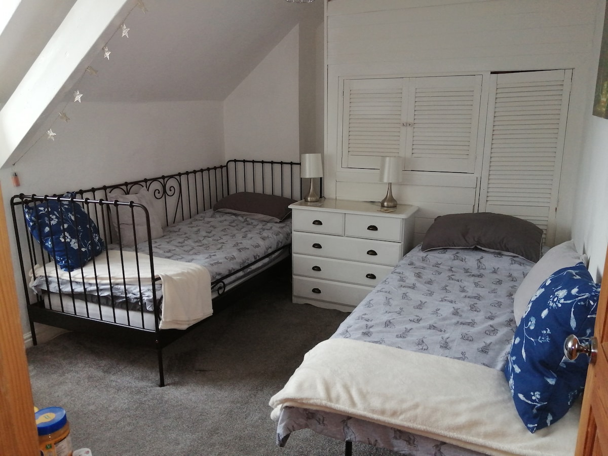 Den øverste etage er udelukkende din. Der er fælles adgang via min hoveddør og den første trappe. Der er 2 soveværelser med dobbeltsenge. Der er en ekstra rejseseng og z-seng til rådighed, hvis du medbringer dit eget sengetøj. Rummelig stue og badeværelse. Til grundlæggende selvbetjening (ingen vask) er der et tv, kedel, mikrobølgeovn, brødrister, dobbelt elektrisk kogeplade og minikøleskab. Alt det nødvendige service. Hvis du bruger alt serviceet inden udtjekning, sætter jeg det i opvaskemaskinen nedenunder.