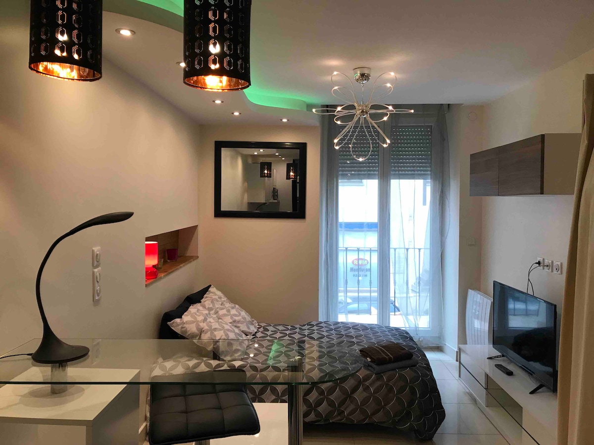 Elégant studio de 32 m2 rénové en Mars 2024 Entièrement équipé pour accueillir dans les meilleures conditions les locataires,situé au rdc d un petit immeuble. Les atouts : - Entrée autonome à partir de 14H et place de parking devant l'appt - Smart TV/ Wifi (gratuit),cuisine équipée -linge de literie (draps,serviettes)inclus - Café et thé inclus, comme à la maison ! -lit double S’il n'y a plus de dispo sur cet appartement consultez nos autres appartements.