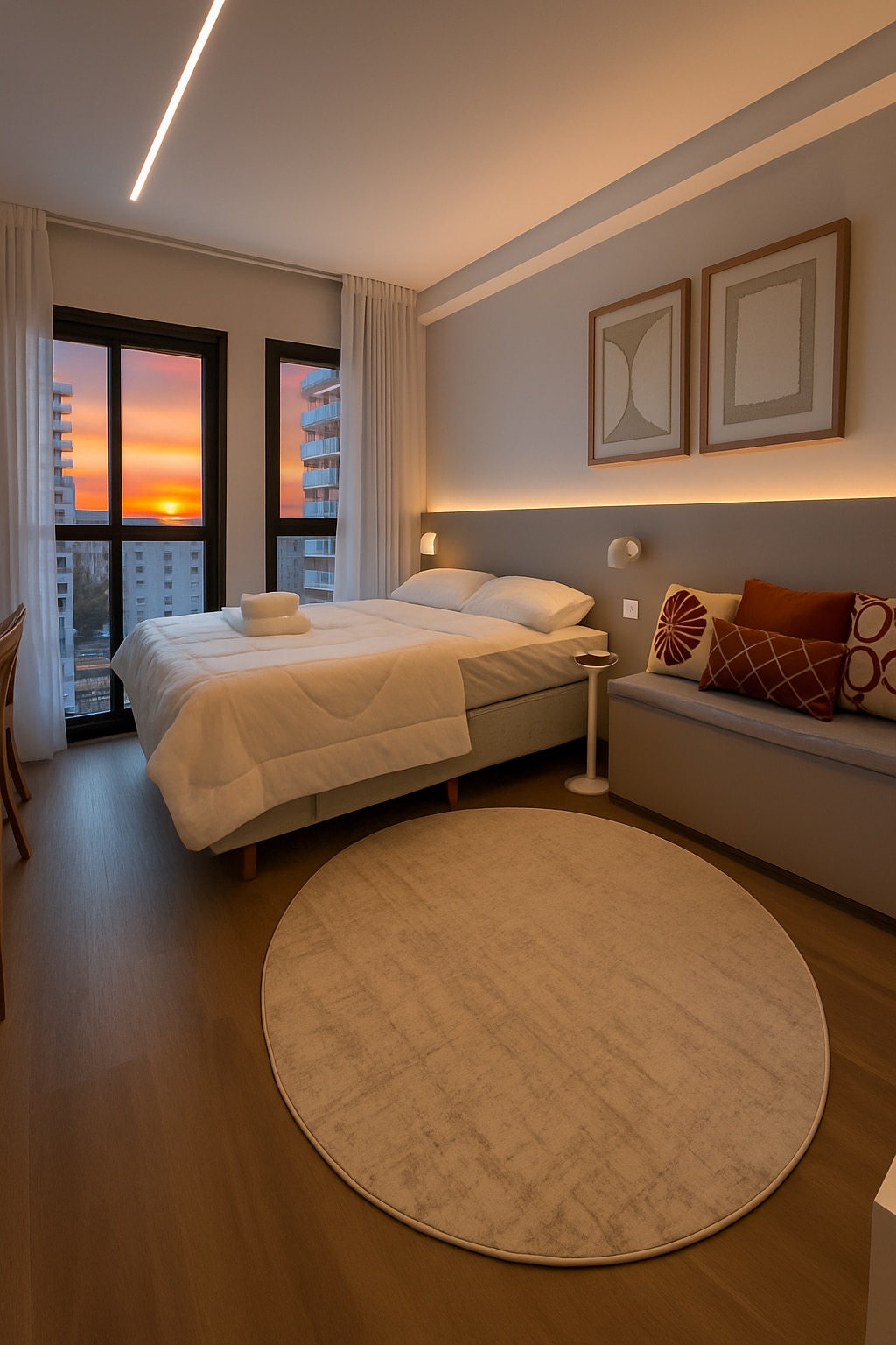 Studio de 40 m2 aconchegante com vista e localização privilegiada. Varanda com vidros e persianas blackout, sofá cama king, lençóis macios e cheirosos de 200 fios , secador de cabelos TAIFFY ,mesa, cadeiras e uma linda vista. Cozinha equipada: geladeira, forno elétrico, fogão, micro-ondas, cafeteira e liquidificador. Taças de espumante, vinho, água e cerveja .Pratos, xícaras, talheres e uma bancada para refeições. Smart TV, ar-condicionado, Wi-fi, vaga garagem e Self check-in😀
