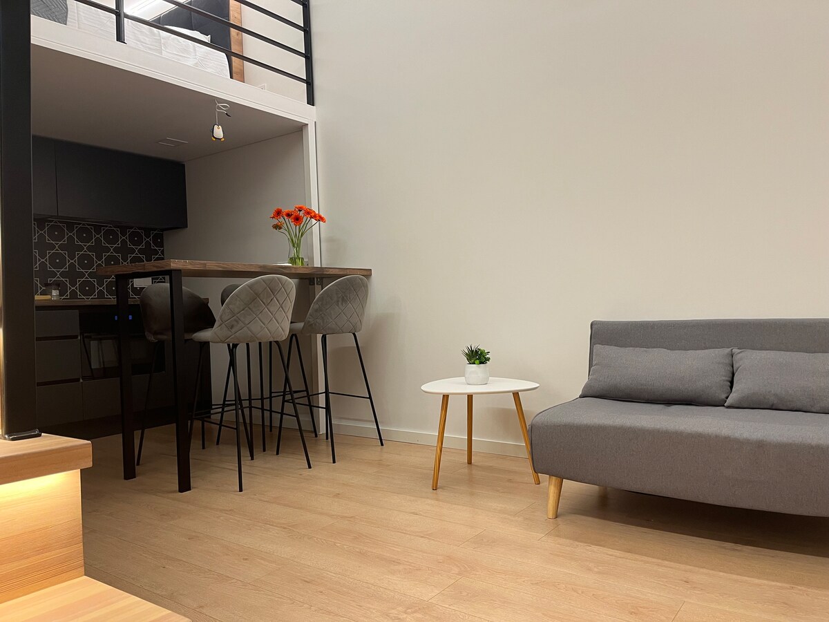 Vi inviterer dig til et moderne og hyggeligt loft beliggende i hjertet af Kaunas i en bygning i industriel stil, en strategisk praktisk beliggenhed mellem byens centrum og Žaliakalnis. Dette stilfulde loft er ideelt til både afslapning og arbejde. Højt til loftet, store vinduer, minimalistisk interiør giver en følelse af plads og komfort. Alt er lige ved hånden, kun få skridt fra Laisvės avenue, tæt på kulturelle attraktioner, restauranter og caféer. Besøg og mærk Kaunas' industrielle charme på et moderne loft.