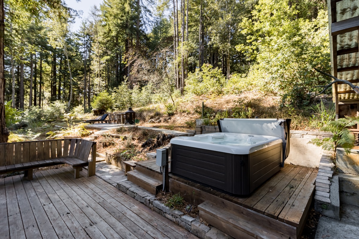 Velkommen til vores private, renoverede, personlige spa i skoven. Herunder en stor finsk sauna, er der en malerisk terrasse med varmt/koldt spring over betagende uberørt skov med bålsted ved vingården. Denne all-cedar hytte ligger under Halleck Vineyard, en af Sonoma Countys prestigefyldte vingårde. Et perfekt fristed. Du er centralt placeret i forhold til det bedste, Sonoma har at byde på Vinsmagninger i Sonoma County (0-20 minutter) Bodega Bay (20 minutter) Armstrong Giant Redwoods (30 minutter)