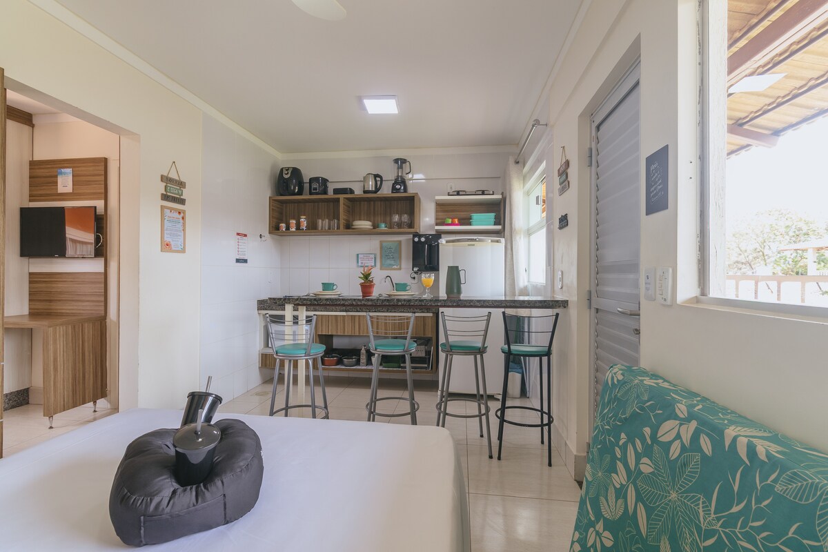 Apartamento aconchegante e preparado com muito amor é o cenário ideal para uma viagem inesquecível. Acesso livre todos os dias 24h/dia ao parque aquático Jardins com 16 mil m² de lazer, 12 piscinas, de ondas, ofurôs, bares, restaurante, brinquedoteca, salão de jogos, academia, toboágua, entretenimento diurno e noturno... Possui 2 camas de casal e 1 colchão extra, 2 TVs, ar condicionado, geladeira, fogão, micro-ondas, purificador, sanduicheira, panelas, talheres, copos, xícaras e muito mais!