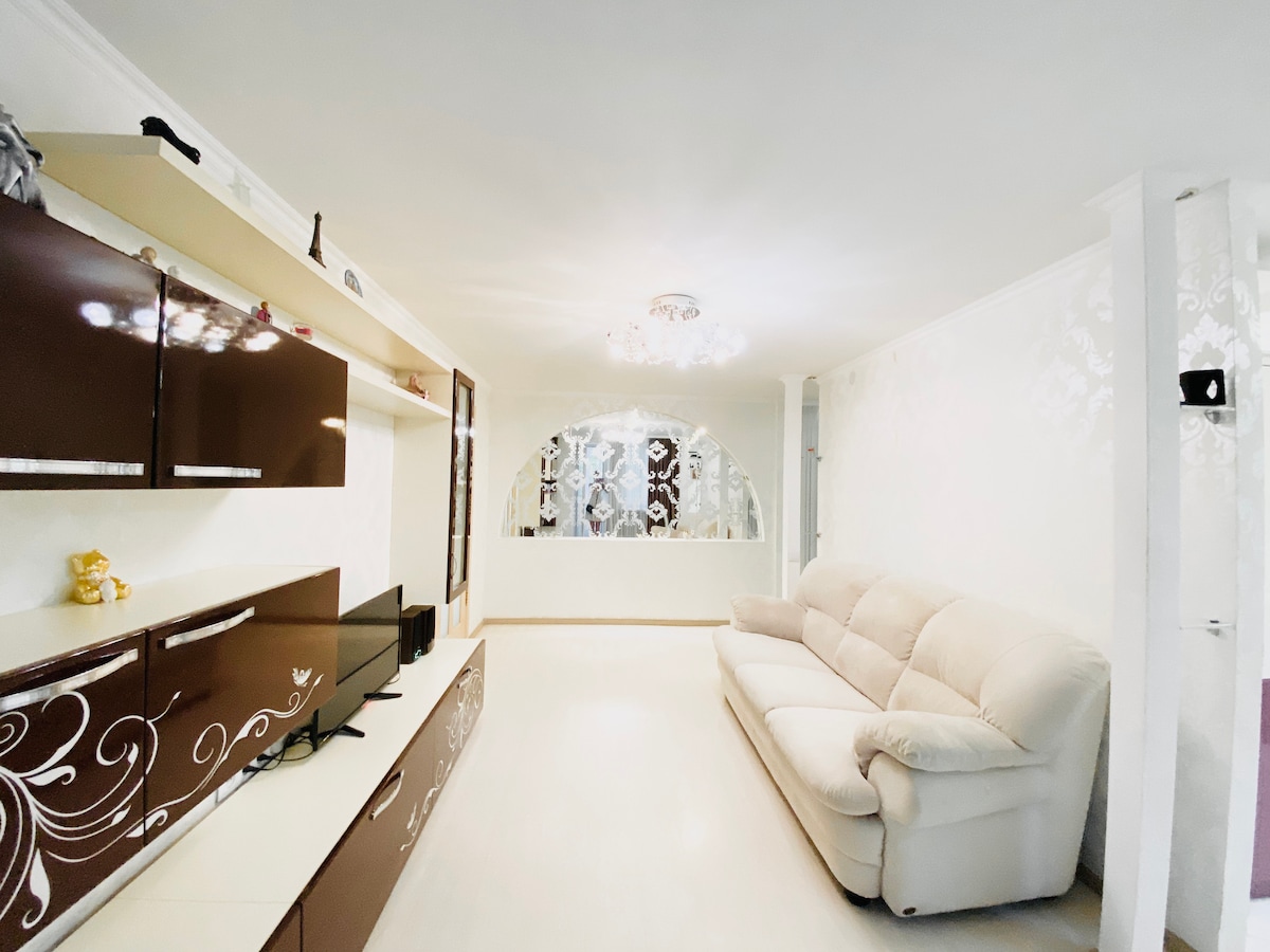 Hyggeligt, rent, med ny renovering. – Til det 4. hospital, hospital – 1,5 km – 7 km til bus- og togstationen – I nærheden af ATB, Silpo, Eva, basar, pizzeriaer, apoteker, bank – Sporvogn 5, minibusser 86, 39 – 5. sal (øverste, ingen elevator) – Gulv til loft-vindue – Dobbeltseng – sovesofa (3 senge) - Balsam Varmt vand – Smart-tv, wi-fi – Bad, vaskemaskine og tørretumbler Mikrobølgeovn, elkedel, køleskab - hårtørrer, strygejern – Service, te, sukker – Friskt sengetøj og håndklæder