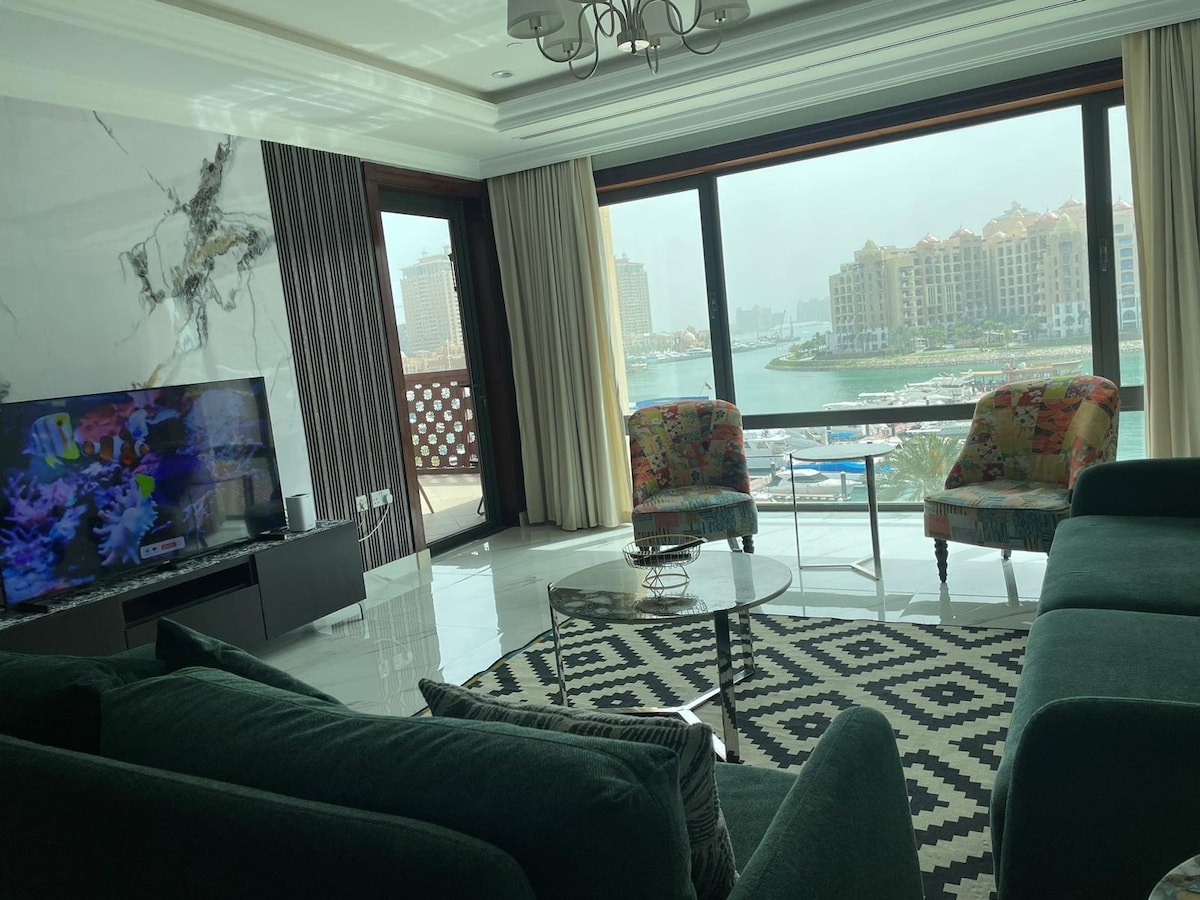 Vågn op til funklende udsigt over marinaen i denne rummelige 1BR-lejlighed i Porto Arabia, The Pearl-Qatar. Nyd en privat balkon, kingsize-dobbeltseng, 1,5 badeværelser, komplet køkken, indbyggede skabe og et rummeligt opholdsområde med et 65" smart-tv. Ideel til par, solo-gæster eller forretningsrejsende. SPAR supermarked nedenunder samt caféer og butikker i nærheden. Inkluderer hurtig wi-fi, parkering, vaskemaskine, frisk sengetøj og sikkerhedsvagt 24/7. Stille, stilfuld og få skridt fra vandet – din perfekte Qatar-ferie!
