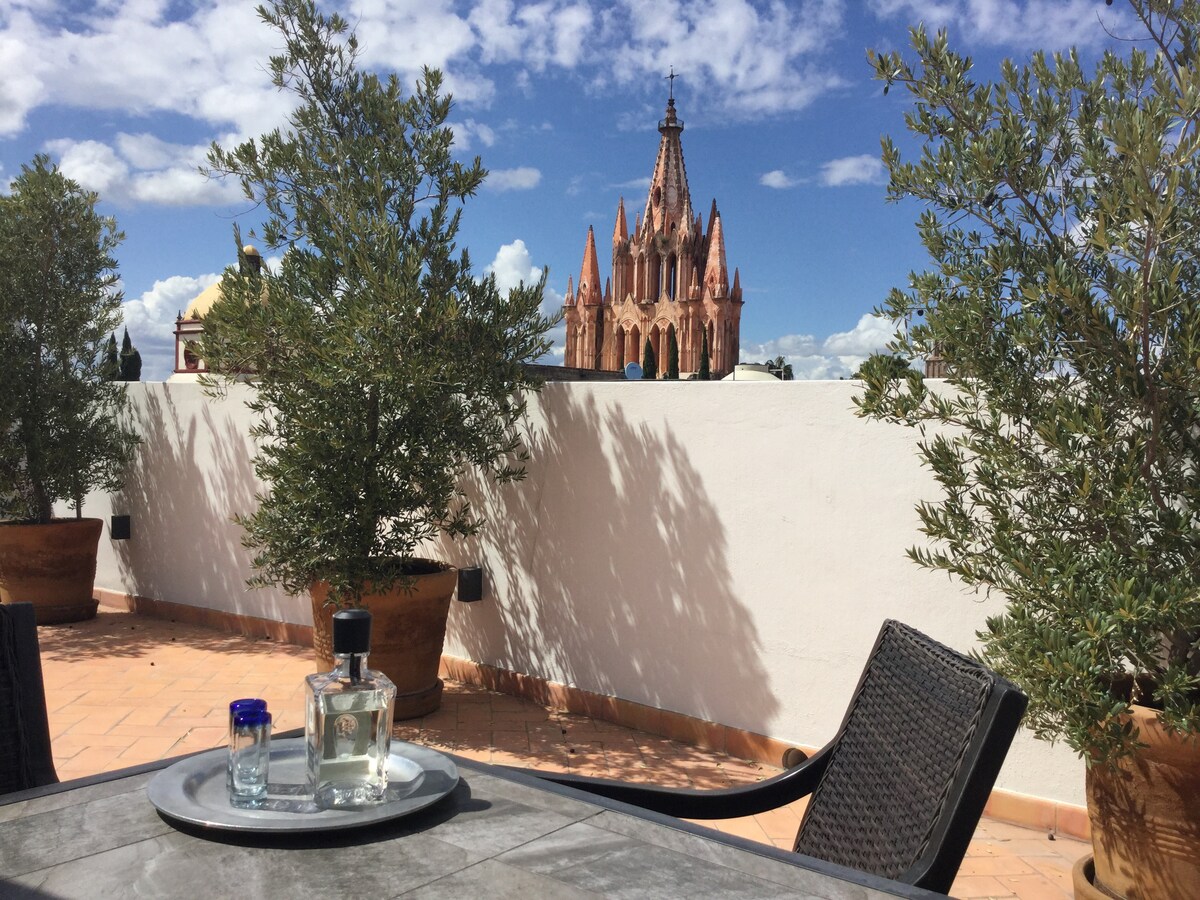Casa Diez de Sollano, trin til Main Plaza og den ikoniske sognekirke. 2 soveværelser, perfekt til par eller venner, hvert soveværelse tilbyder aircondition-varmeenhed, private badeværelser og hyggelig komfort for op til 4 voksne. Nyd daglig hjemmelavet frisk morgenmad for at starte dagen og rengøringen. Træd udenfor for at udforske San Miguels fineste spisesteder, butikker, kunst og meget mere. Slap af på tagterrassen med en fantastisk udsigt til San Miguel-kirken og solnedgangen. Et hyggeligt bålsted til magiske aftener.