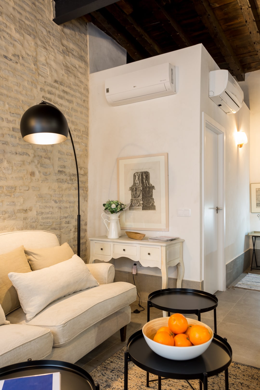 Smukt restaureret byhus, der er omdannet til en moderne feriebolig, hylder den gamle bygningsstruktur med varmt, moderne interiør og et strejf af industriel stil. Franske vinduer fra gulv til loft vender ud over traditionelle balkoner til den charmerende gade nedenfor. Sollys oversvømmer det åbne område, kaster lys på synlige sandstensvægge og belyser de fantastiske egebjælkelofter. Den fælles terrasse på øverste etage tilbyder en utrolig udsigt til katedralens tag og Giralda.
