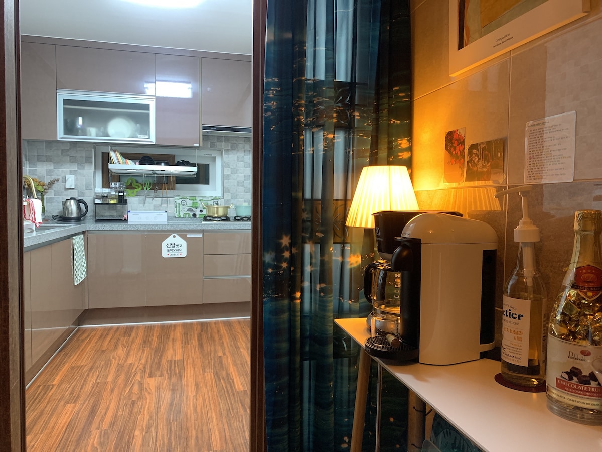 Det er et hus beliggende på en bakke på vestkysten af Geoje-do. Det er et hus, som værtsparet selv har repareret og finpudset gennem mange år. Det er en følelsesmæssig bolig, der er indrettet med europæisk sensus med miljøvenlige materialer, samtidig med at det gamle hus' udseende så meget som muligt. Det lave tag og den unikke struktur af det gamle hus er sjovt, og du kan mærke landsbyhusets stemning. Det er beliggende i midten af landsbyen, hvor Dundeok-myeons kontor er placeret, og Hanaro Mart, en kinesisk restaurant, Hotpples hjemmelavede burgere, en kiosk, en kyllingrestaurant, Hotpples kødbutik, en butik med småting, 5 Blue Ribbon-caféer og andre restauranter er placeret omkring landsbyhuset, så du kan bruge alle disse bekvemmeligheder til fods. Der er en bugt, der fører ud til havet, 3 minutters gang væk, Du kan gå langs promenaden til havet, mens du nyder den smukke udsigt over floden. Det er et sted, hvor du kan føle stemningen i en rolig og varm landsby Det er et godt sted at udforske de berømte turistattraktioner i området. Den nøjagtige beliggenhed af boligen er 6, Hadun 3-gil, Dundeok-myeon, Geoje-si, og vi vil informere dig igen, så snart reservationen er gennemført. Check-in kl. 15.00 Check ud kl. 12.00