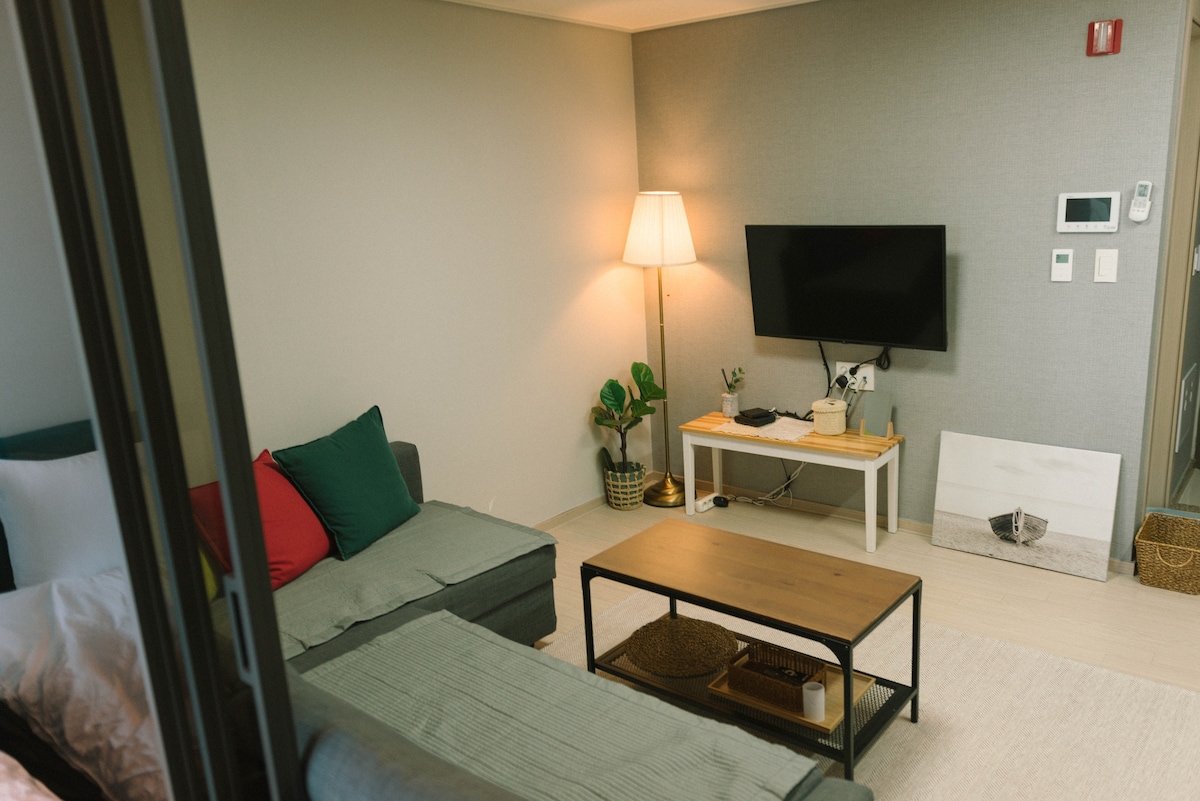 Hej, det er "Hej, Hanseom". Hej, Hanseom er et sted, hvor du kan bo komfortabelt og sjovt, når du rejser med din elskede eller familie til Østhavet. Hanseom-stranden ligger 5 minutters gang væk, og du kan sidde ved stuebordet og nyde havudsigten. Det er et særligt sted, hvor du kan have det sjovt i boligen, mens du ser Netflix med en projektor og en 100 tommer skærm installeret i soveværelset. Det er en bolig med havudsigt, der består af➰ 1 soveværelse, stue, køkken og 1 toilet. ➰ Soveværelset har en queensize seng, og stuen har en sovesofa, så der er plads til op til 4 personer. Du kan se Netflix med en projektor og en 100 tommer skærm i➰ soveværelset. Der er installeret en➰ vindfri aircondition i hver af stuen og soveværelset. Der er et indbygget køleskab, elektrisk kogeplade, mikrobølgeovn, trykkoger og kaffekande i➰ køkkenet, så du kan lave mad. Der ➰ er en indbygget tromle, så du kan vaske tøj. ➰ Body shower, shampoo, balsam, skumrens og tandpasta er tilgængelige.(Tandbørste og badehåndklæde er ikke inkluderet.) ➰ Kæledyr er ikke tilladt.